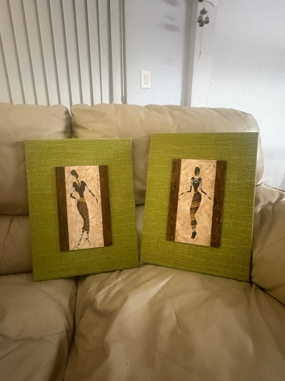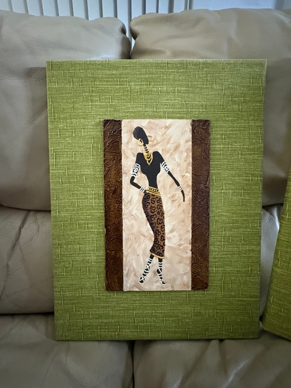 Two pieces of wall art depicting African woman. The paintings is a canvas print that are approximately 15” by 12”.