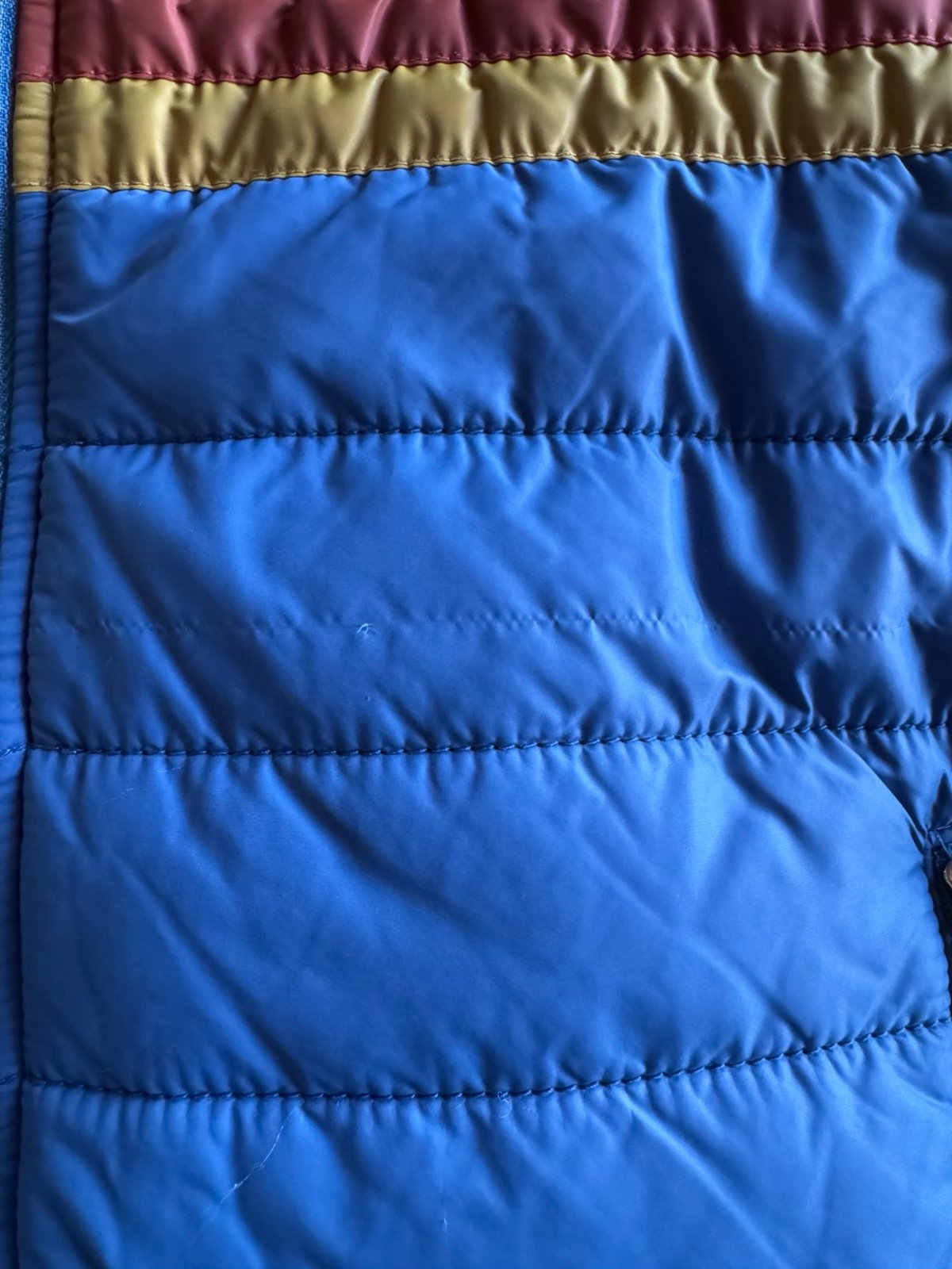 This is a women’s small. One of the sleeves has a couple of light fabric pulls (see pic) that were there when I bought it but to me, it’s not that noticeable