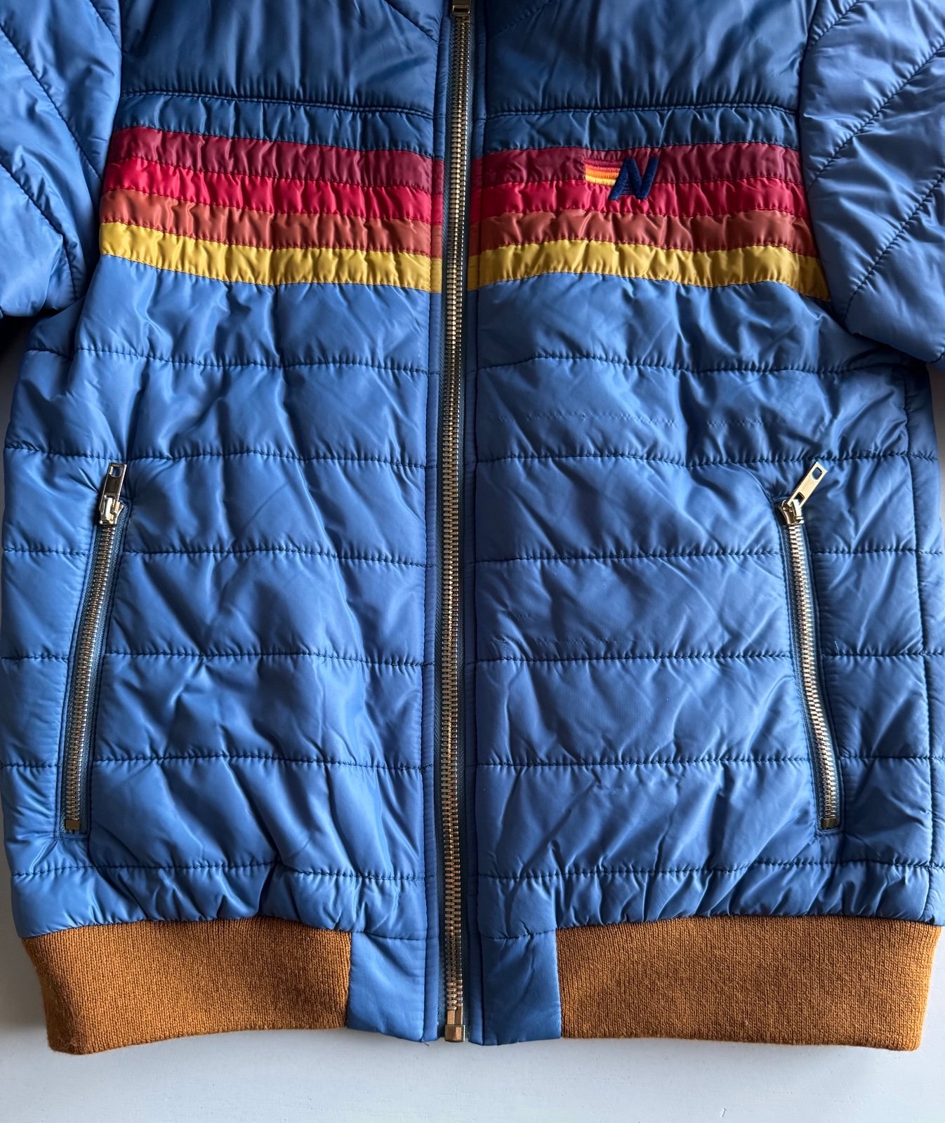 This is a fantastic Aviator Nation jacket worn about three times. I believe it is the Journey jacket but I can’t remember for sure. It’s the lighter weight jacket that they used to sell for women. The color is a very nice lighter blue that I don’t see on the website anymore. I bought this new only ended up wearing it a couple of times and it’s too nice to just sit around!