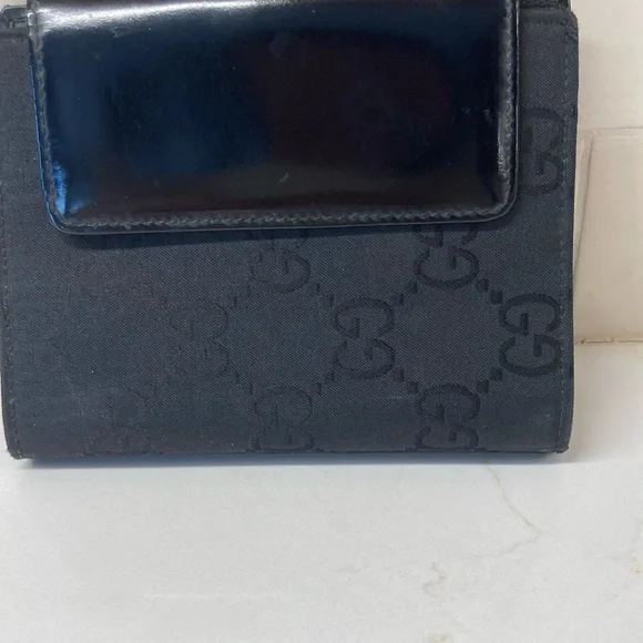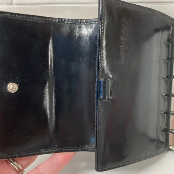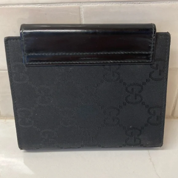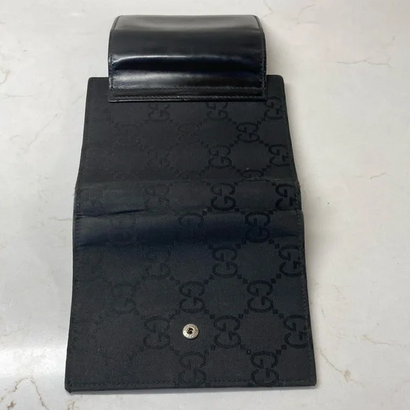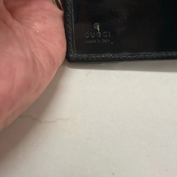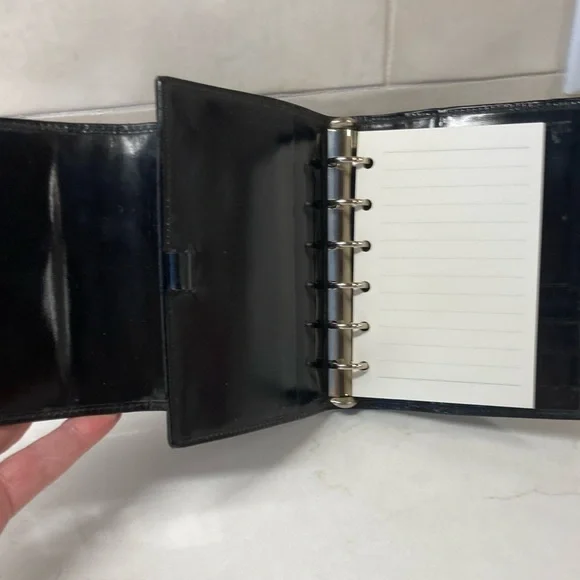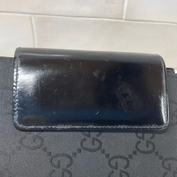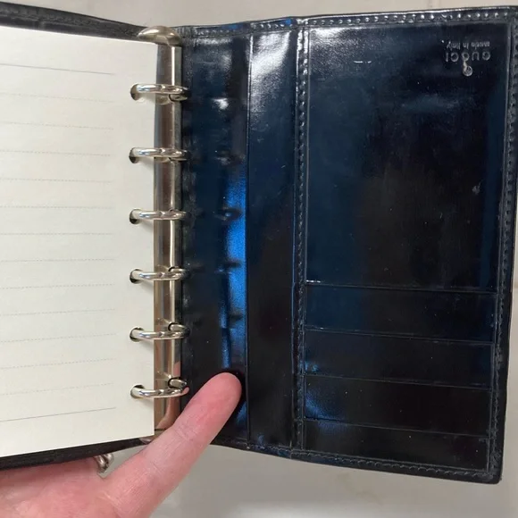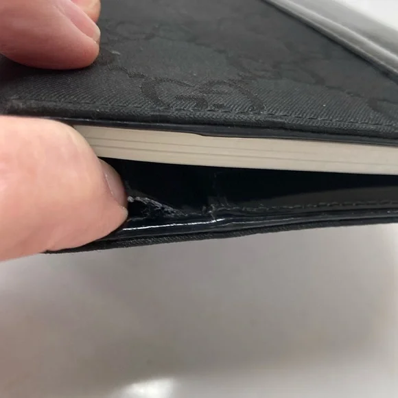 Elegant Gucci agenda with monogram design. Sleek and stylish. black leather and GG jacquard. New paper comes with. Ready to use! Snap is snappy. Two slit pockets and 4 card slots.place for small pen. Callouts are a place in front on the leather where there is a mark where it’s not shiny. This is only visible if the light is right. There is also a small tear where the long slots are. Both are shown in pictures. This is a nice gucci agenda ready to help keep you organized. Additional paper can be had at Amazon.
