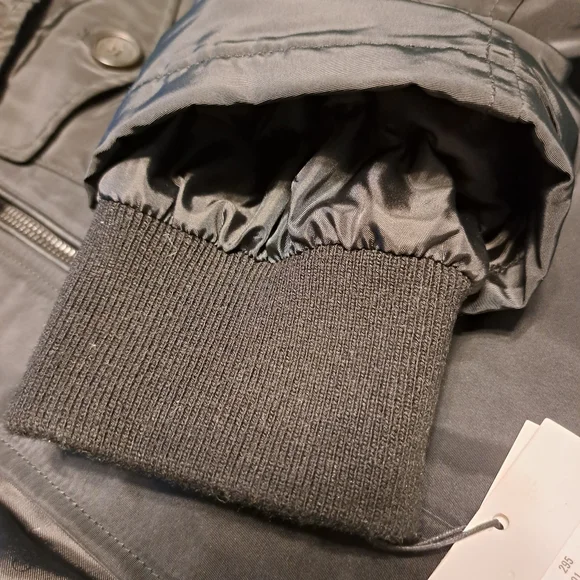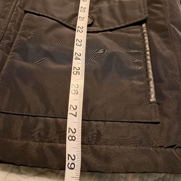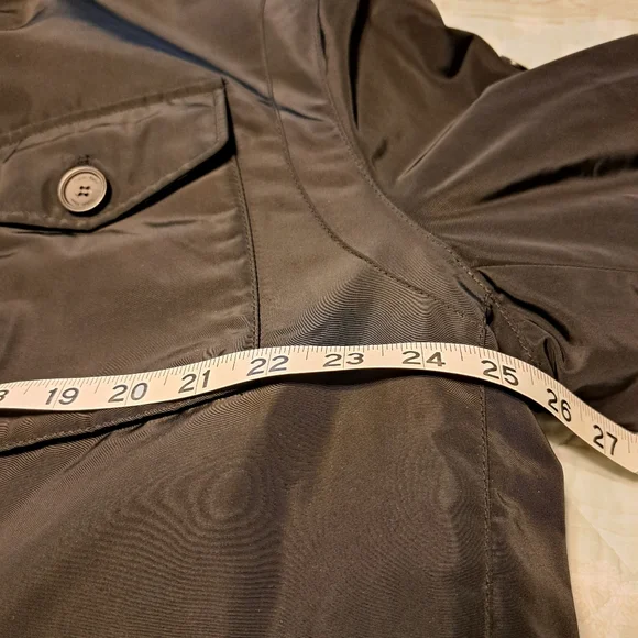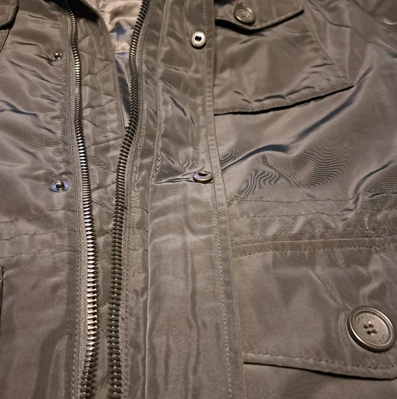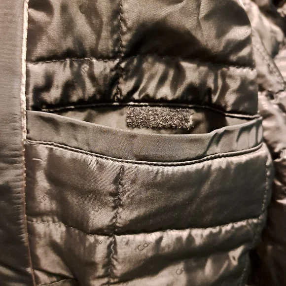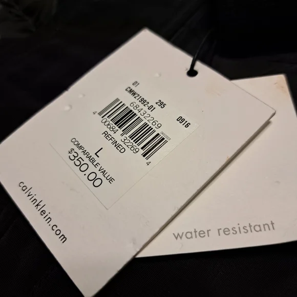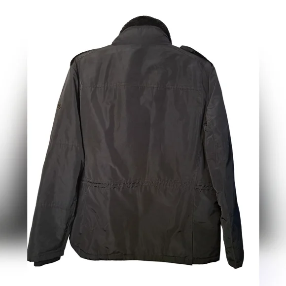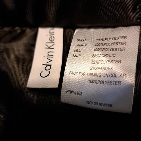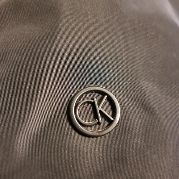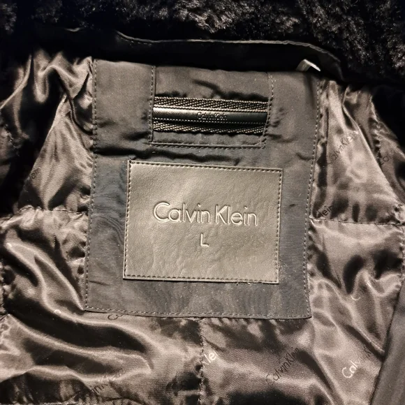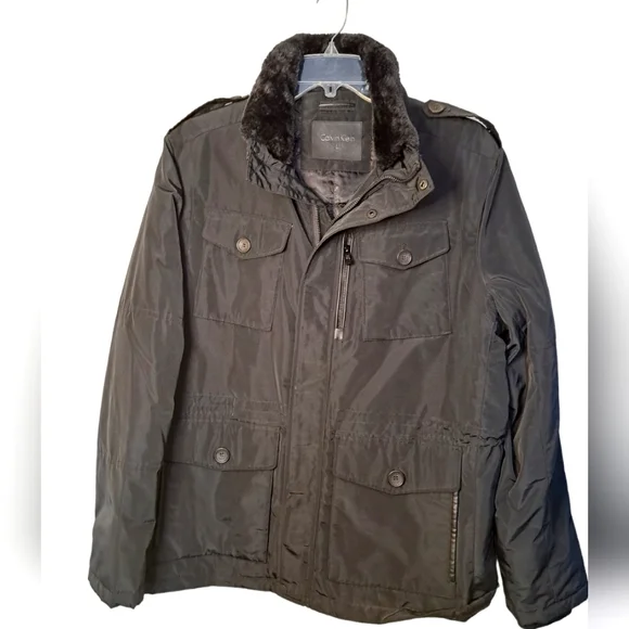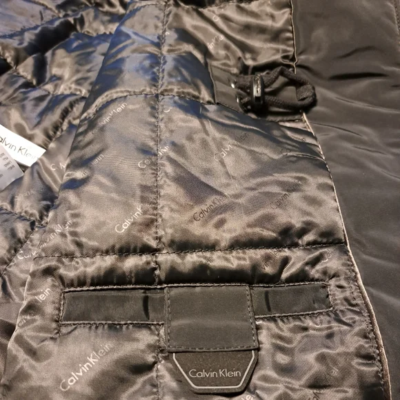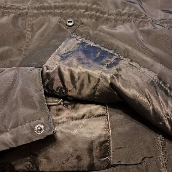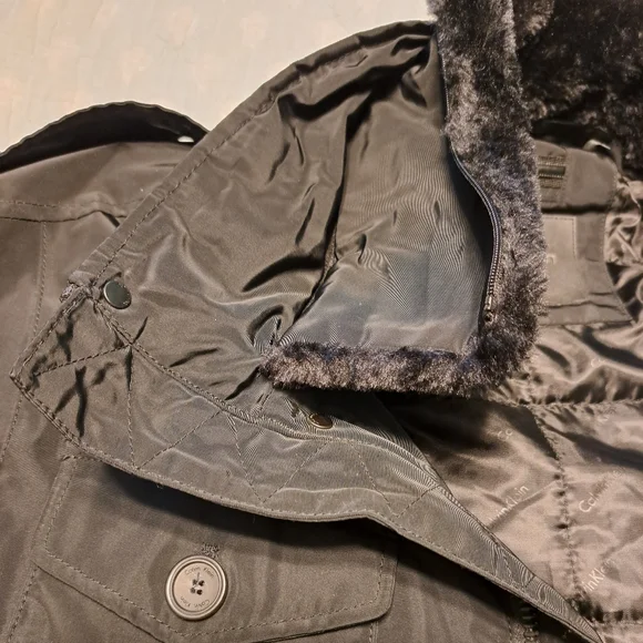 Black water resistant coat with removable faux fur collar by Calvin Klein. Zip up with snap over flap. Outside has four button pockets and one vertical zipper pocket. Quilted inside has three velcro pockets and drawstring to cinch waist. Back has two snaps to loosen bottom. CK logo on sleeve. Brand new with tags. Size Large