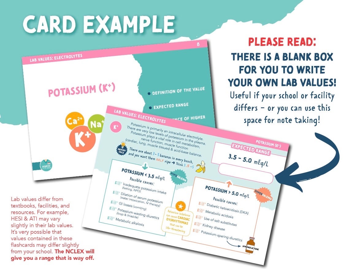 Super helpful and amazing flashcards made by Nurse in the Making covering common lab values! Includes flashcard box it came in as well as a larger heavy duty one I labeled and used because it was way more durable and easy to flip through when studying than the box it came with. In EXCELLENT condition and full of amazing information. Some cards have markings on them, but none are damaged or missing! Used throughout nursing school and to study for the NCLEX! Absolutely loved these and only selling because I luckily do not need them anymore :) $57 New