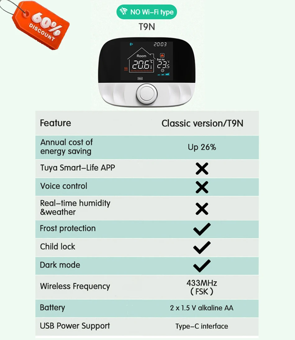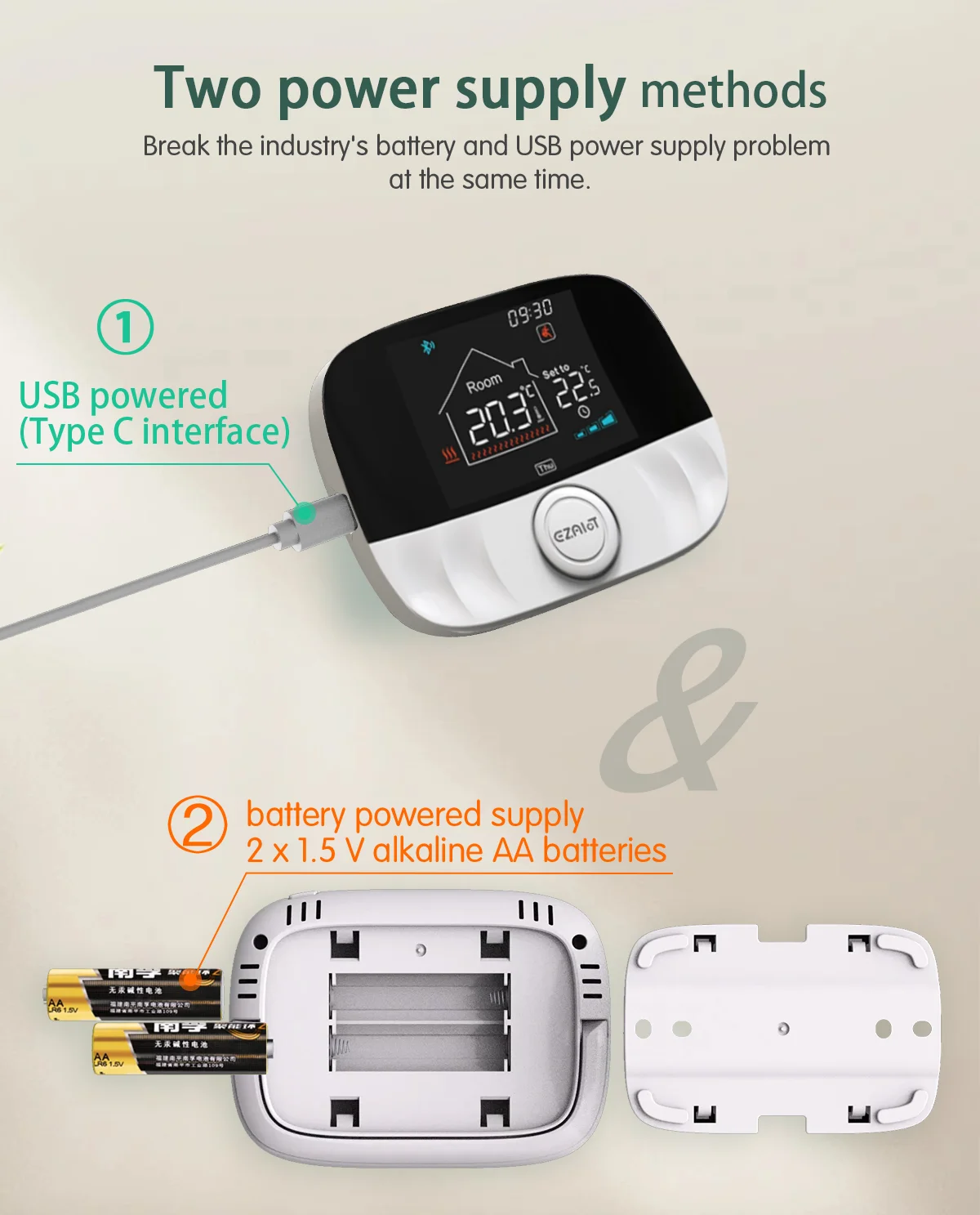 Thermostat power supply: 2*1.5V alkaline batteries/ USB power supply (Type-c interface)