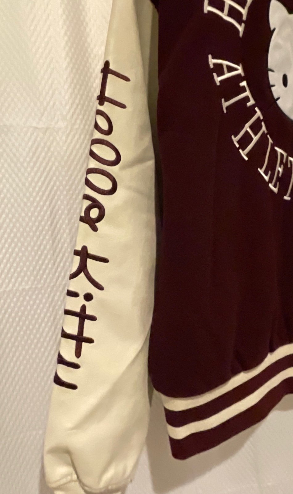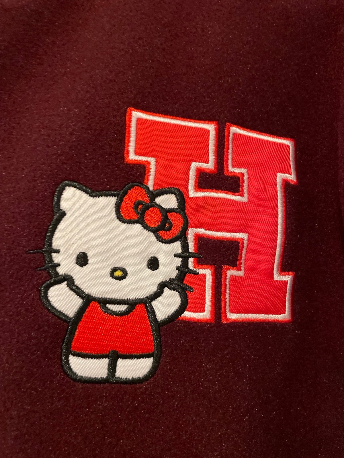 Embroidered Hello Kitty Athletic Dept. text & character face appliqué on the back