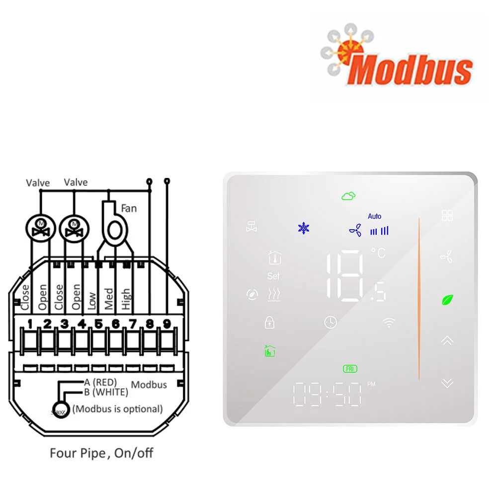 Zigbee & Wi-Fi & MODBUS TUYA Thermostat for Fan Coil Unit, 2P/4P, Cooling/Heating Function, RS485 95-240V, Smart HVAC Control 12VAC 24VAC 95-240VAC.For Fan Coil Unit Work with Alexa Google Home YANDEX Alice